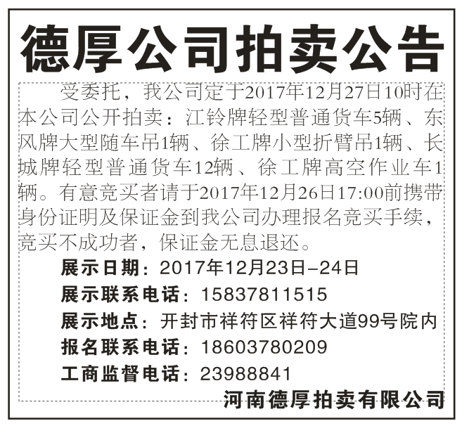 2017-12-25|发布者:河南德厚拍卖有限公司|点击数: