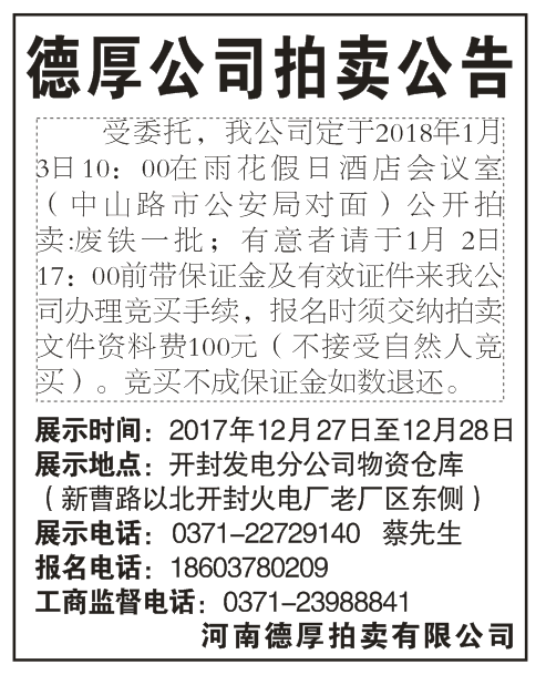 2018-01-05|发布者:河南德厚拍卖有限公司|点击数: